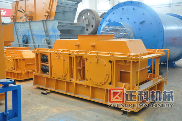 2、出料粒度的調節:兩輥輪之間裝有楔形或墊片調節裝置,楔形裝置的頂端裝有調整螺栓,當調整螺栓將楔塊向上拉起時,楔塊將活動輥輪頂離固定輪,即兩輥輪間隙變大,出料粒度變大,當楔塊向下時,活動輥輪在壓緊彈簧的作用下兩輪間隙變小,出料粒度變小。墊片裝置是通過增減墊片的數量或厚薄來調節出料粒度大小的,當增加墊片時兩輥輪間隙變大,當減少墊片時兩輥輪間隙變小,出料粒度變小。